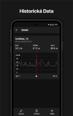 Ponořte se do světa zvuků s detailními vizualizacemi. Naše aplikace nabízí graf v reálném čase, který zachycuje dynamiku okolního hluku s přesností. Okamžitě uvidíte minimální, maximální a průměrné hodnoty v decibelech (dB), což vám umožní snadno identifikovat klidné chvíle i zvukové špičky. Díky přehlednému a čistému uživatelskému rozhraní je ovládání hračka, ať už sledujete denní ruch nebo noční klid, k čemuž je uzpůsoben i speciální denní a noční režim. Každé měření je navíc opatřeno přesným časovým údajem, což usnadňuje sledování časových trendů.